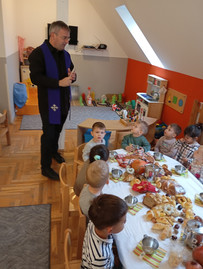Nakon mnogobrojnih aktivnosti vezanih uz obilježavanje " Dana kruha i dana zahvalnosti za plodove zemlje " u Vrtiću je 18.10. održan blagoslov kruha. Svako dijete je donijelo u Vrtić dio krušnih proizvoda koje je izradilo kod kuće zajedno s roditeljima, a posebno za ovu priliku. Naši blagdanski stolovi bili su prepuni raznih kiflica, peciva, kolača, štrudli, kuglofa kojima smo se i zasladili nakon blagoslova. Zahvaljujemo našim roditeljima što iznova svake godine njeguju zajedno s nama ovu tradiciju.